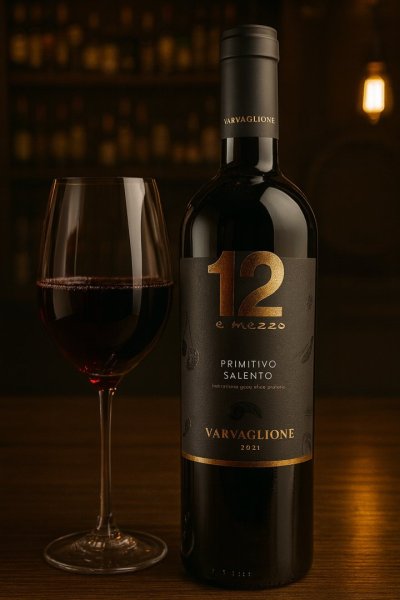 12 e Mezzo Primitivo Salento IGP Rosso corposo e dal carattere caldo, con aromi di frutta rossa matura, confettura e leggere note vanigliate. 12,5% vol