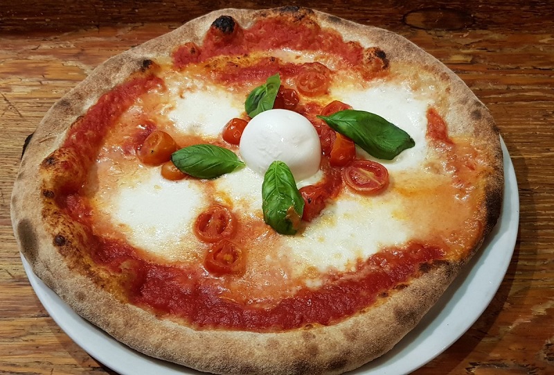 (pesto di basílico,fior di latte di agerola,datterino giallo del vesuvio, pancetta arrotolata e stracciatella)