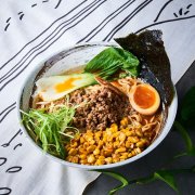 Topping: uovo Tamago, cipollotto, alga Nori, nikumiso (ragù di carne mista insaporito col miso), mais e verdure a foglia di stagione.