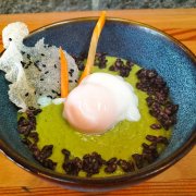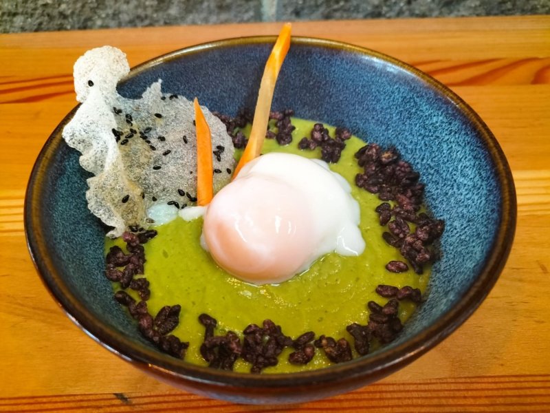 L'ovetto ONSEN viene servito su una crema di cavolo nero, zucchine e zenzero assieme a funghi shiitake impanati e fritti e ad una crema di zucca.Decorazione con alga croccante e germogli di pisello.