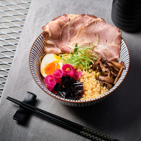 Topping: ovetto, funghi shiitake, cipollotto, alga Nori, germogli di soia, pancetta di maiale arrotolata CHASHU