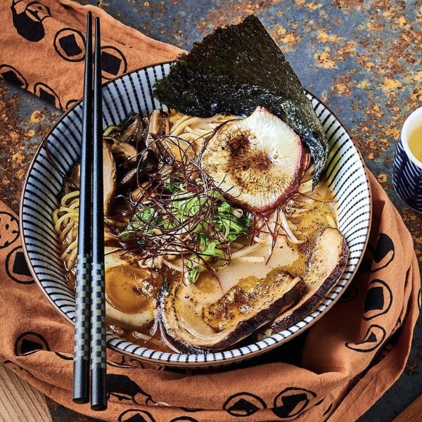 Brodo vegetale a base di pomodoro e zucca, soia e sesamo. Completano l'opera i noodles del Pastificio Feltrino, l’uovo Ajitama e le verdure di stagione.