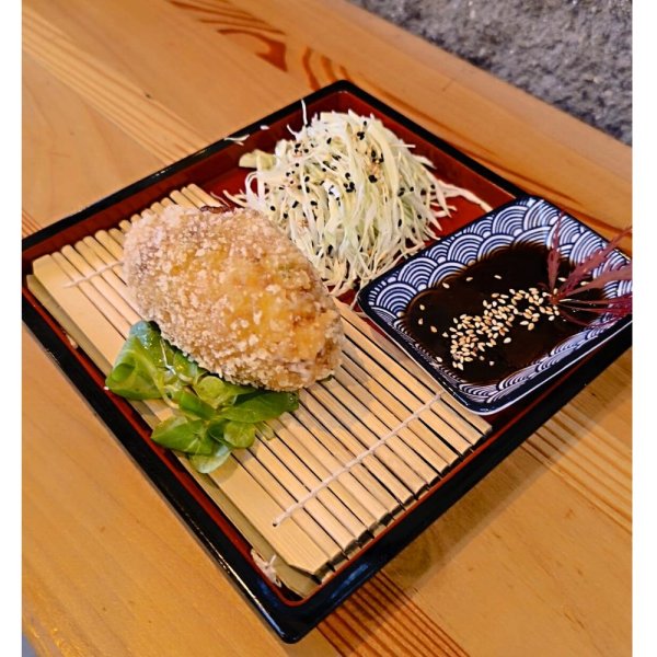 Crocchetta di patate - Korokke - giapponese con patate e verdure, speziata al wasabi e curcuma, avvolta in croccante panko. PER MAGGIORI INFO ↓.