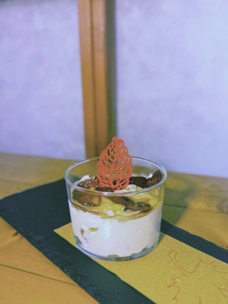 Yogurt bianco e yogurt greco si incontrano in un dessert delicato che unisce cremosità e tradizione giapponese. Protagonista è l’hoshigaki, antica preparazione del Giappone: cachi maturi sbucciati, appesi ed essiccati lentamente all’aria per settimane o mesi, massaggiati a mano fino a sviluppare una naturale dolcezza intensa e una consistenza morbida e vellutata. A completare il piatto una leggera gelatina di sake, che aggiunge freschezza e un elegante profumo di riso fermentato. Disponibile anche senza glutine.