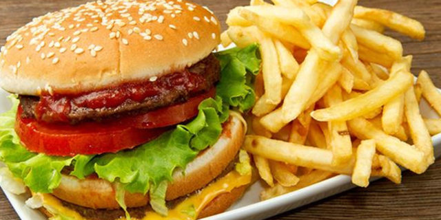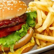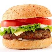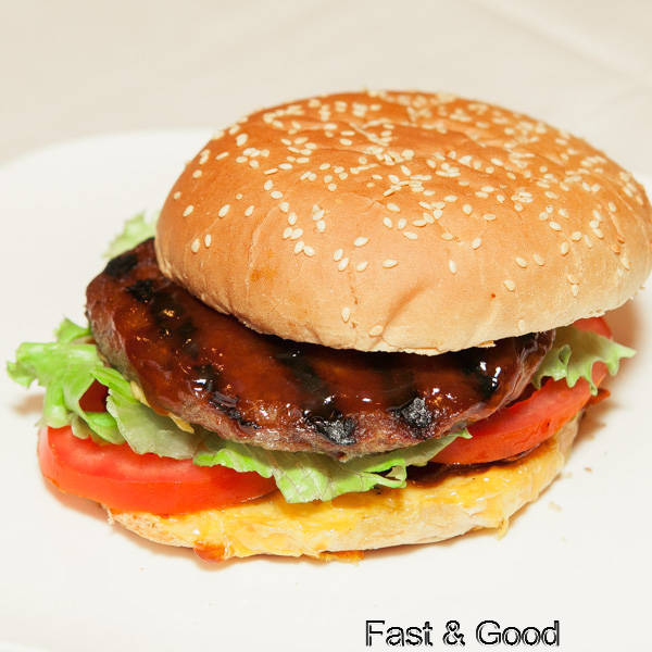 Pane al sesamo, hamburger Black Angus da 200gr, insalata, pomodoro, ketchup, maionese Cartoccio patate fritte