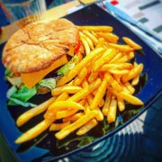 Servito con Patatine Fritte. Carne di Manzo ,uova Bio Cotte alla Piastra, cheese, insalata Pomodori e Mayonese