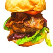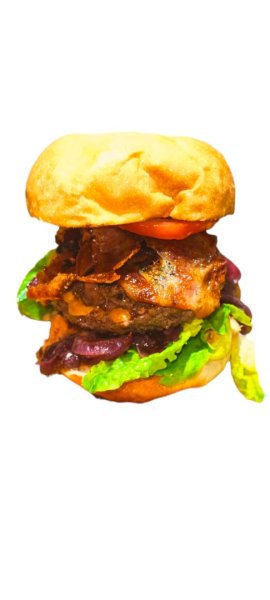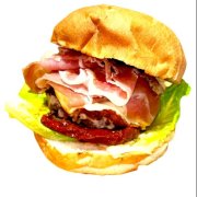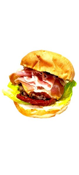 pane, 1 hamburger 150gr, cheddar, bacon, anelli di cipolla, rucola, pomodori secchi, salsa NorAnd's