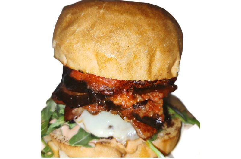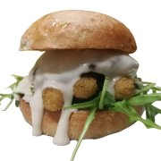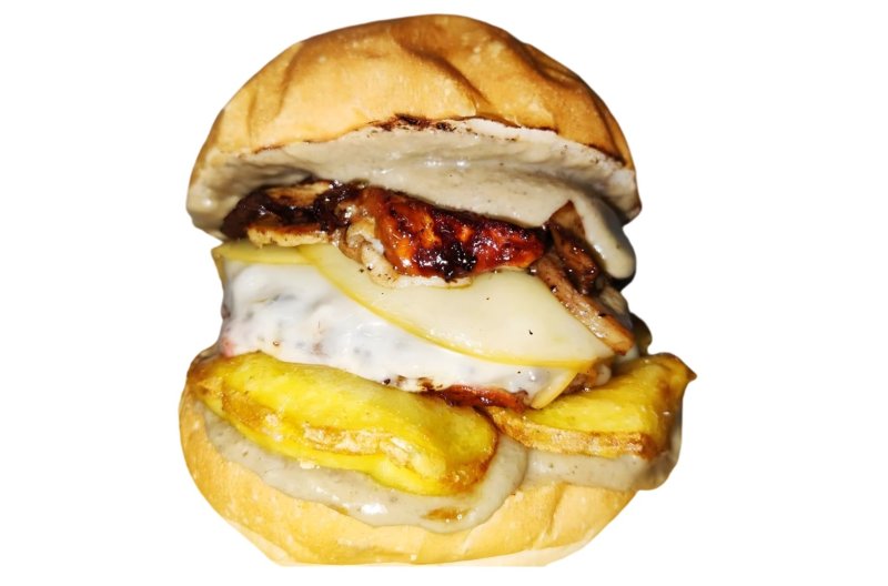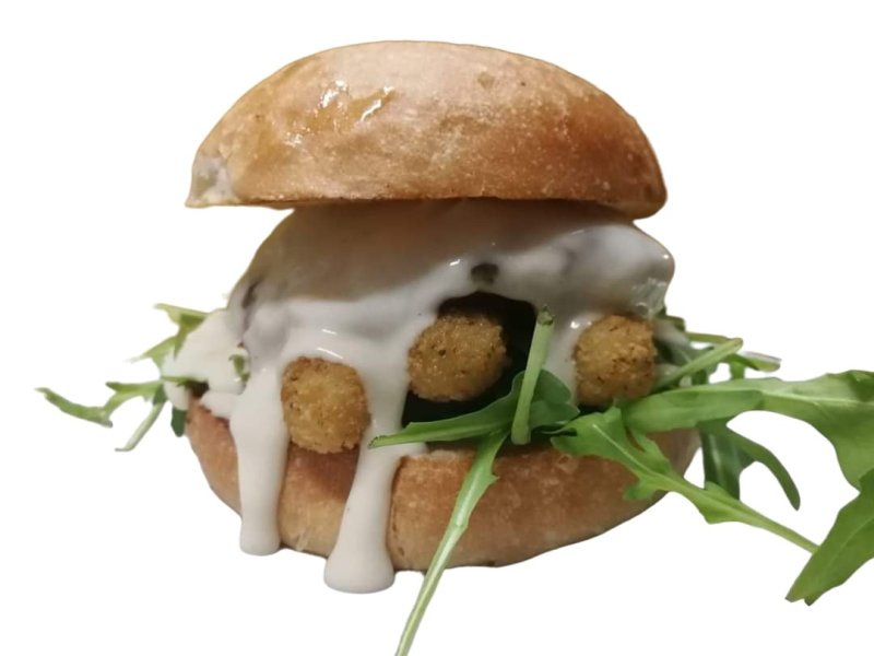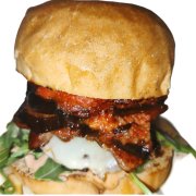 pane, 1 hamburger 150gr, provola, tomino con bacon, rucola, salsa tartufata, maionese.