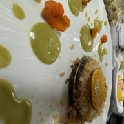 Cappelletti con ripieno di cernia su vellutata di pachino giallo e crumble di mandorla