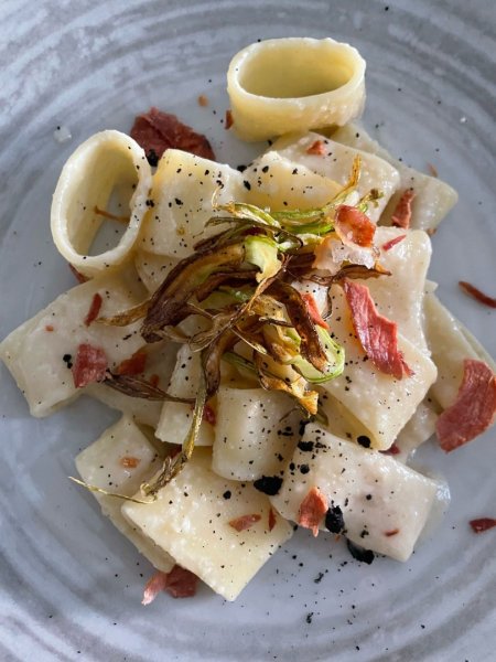 Fior di latte, crema di zucchine, speck, noci e mandorle