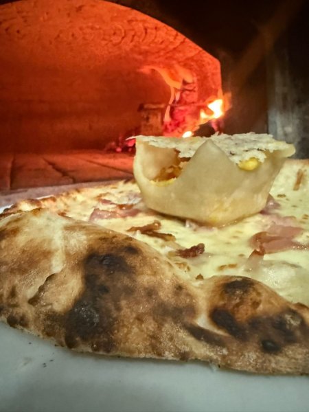 Pomodoro, fior di latte, pancetta, cipolla caramellata e nduja