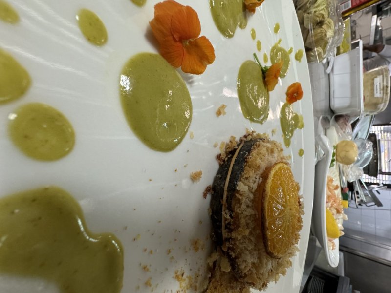 Scialatiello con gamberi rossi, chips di zucchine, gocce di burrata e polvere di arancia
