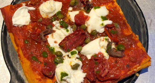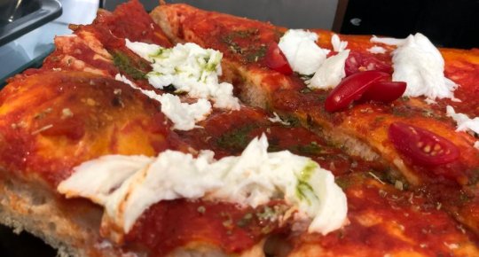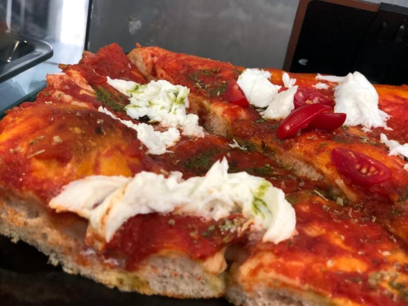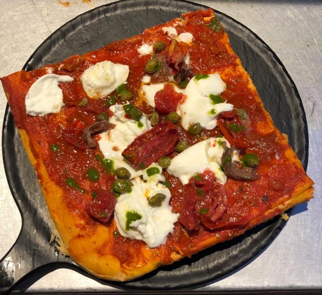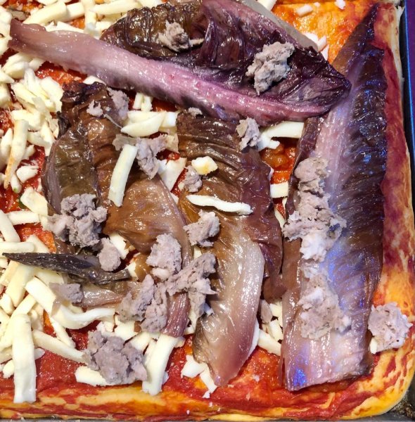Pomodoro, mozzarella di bufala, scamorza, bacon, radicchio di Treviso, grana