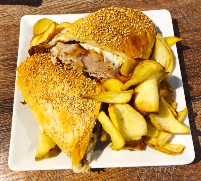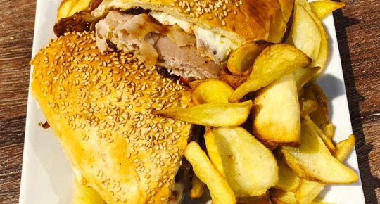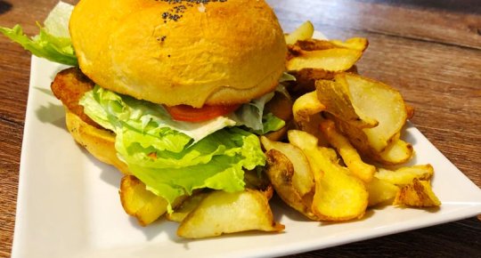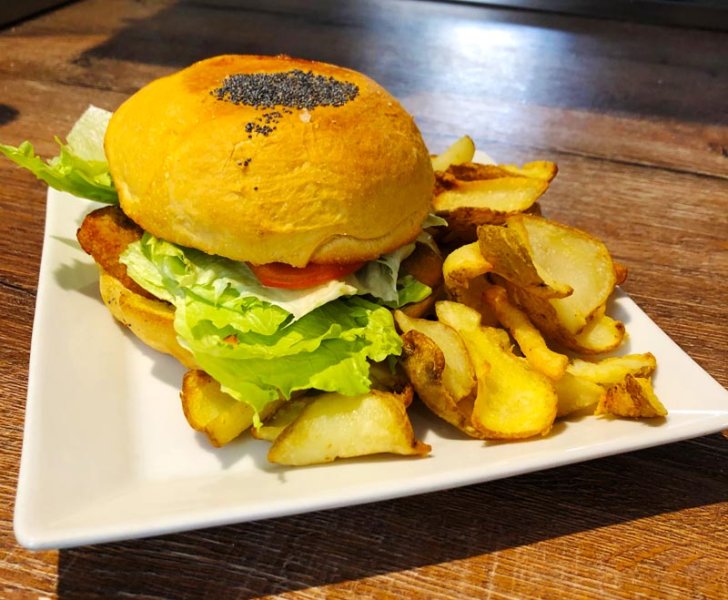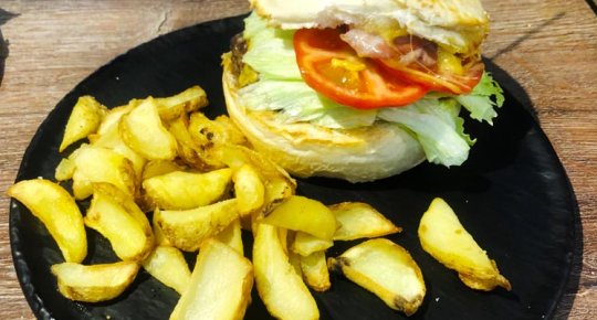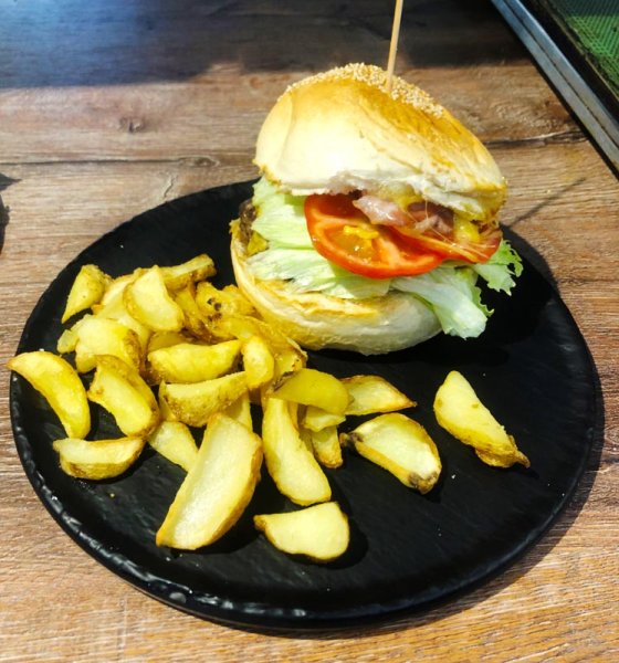 Burger di Angus da 220 gr., crema di pecorino, radicchio al forno, cipolla caramellata, bacon, salsa BBQ, completo di patate fritte