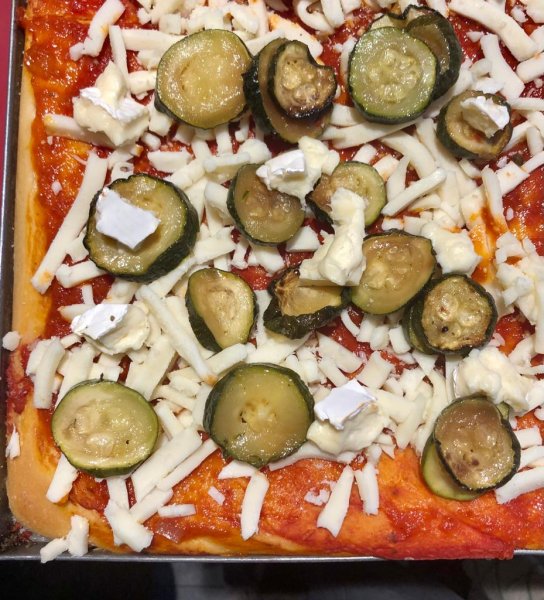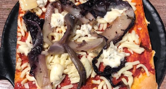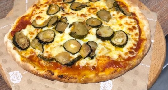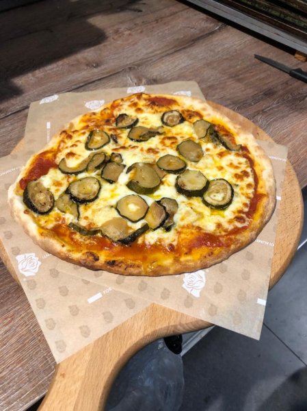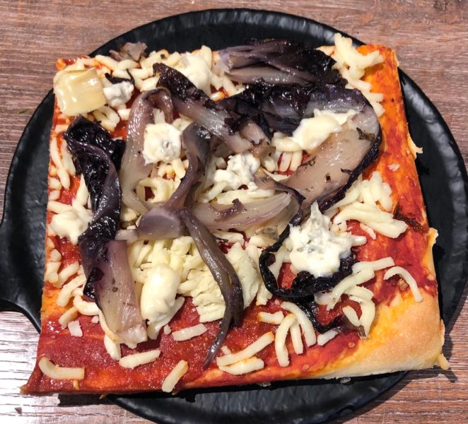 Pomodoro, mozzarella, melanzane, radicchio di Treviso, salamino piccante, gorgonzola, grana