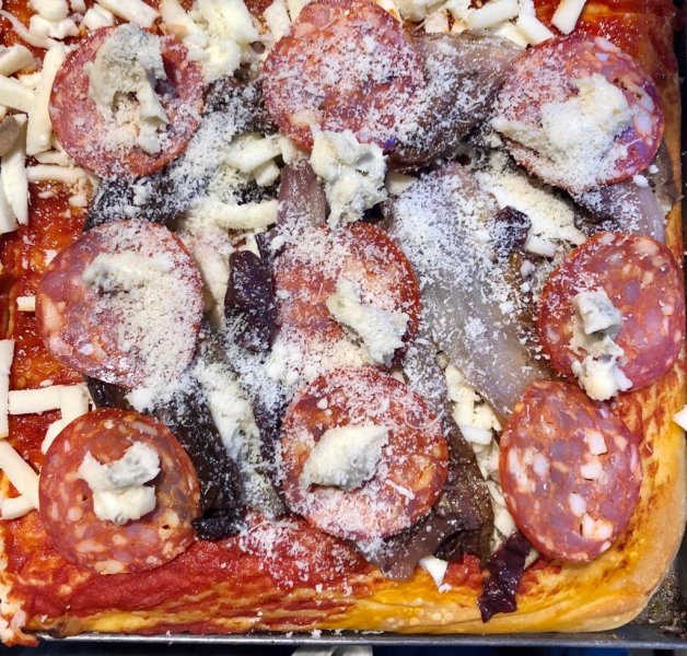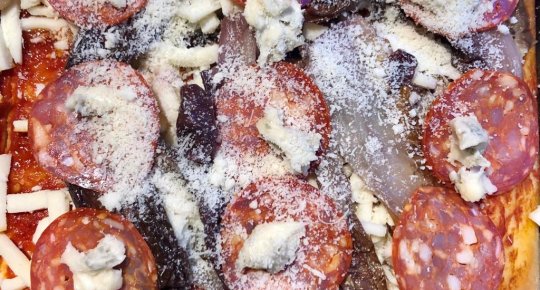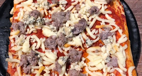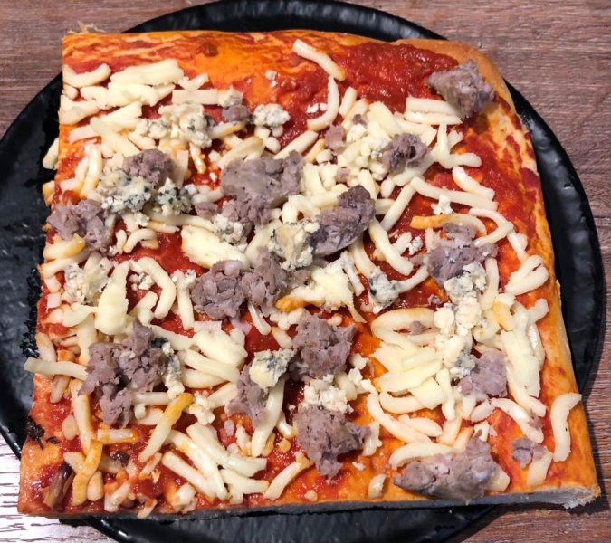 Pomodoro, mozzarella, salsiccia, gorgonzola piccante
