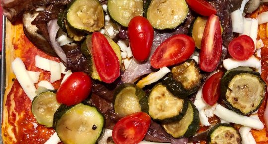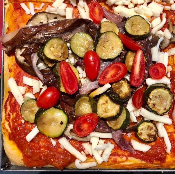 Pomodoro, mozzarella, prosciutto cotto, melanzane grigliate, grana