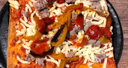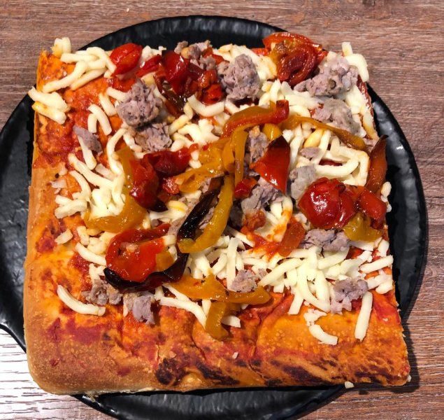 Salsiccia, Peperoni cotti al forno, Cipolla caramellata, Crema Formaggi, Salsa BBQ