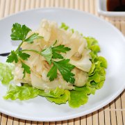 Ravioli al vapore ripieni di gamberi*, capesante*, surimi e cipollotti