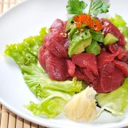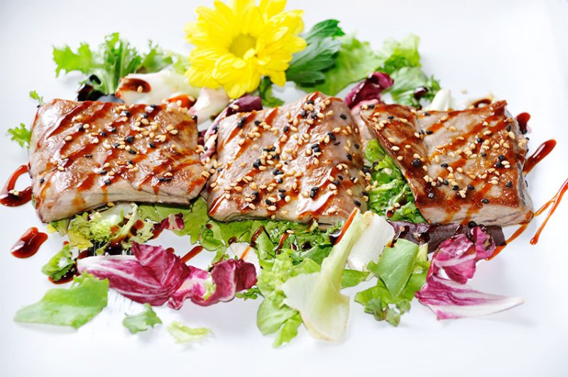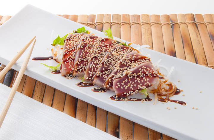 Carpaccio di tonno con aceto di riso, sesamo e cipollotti