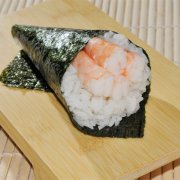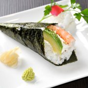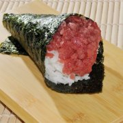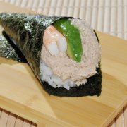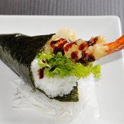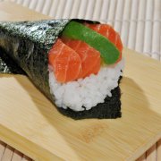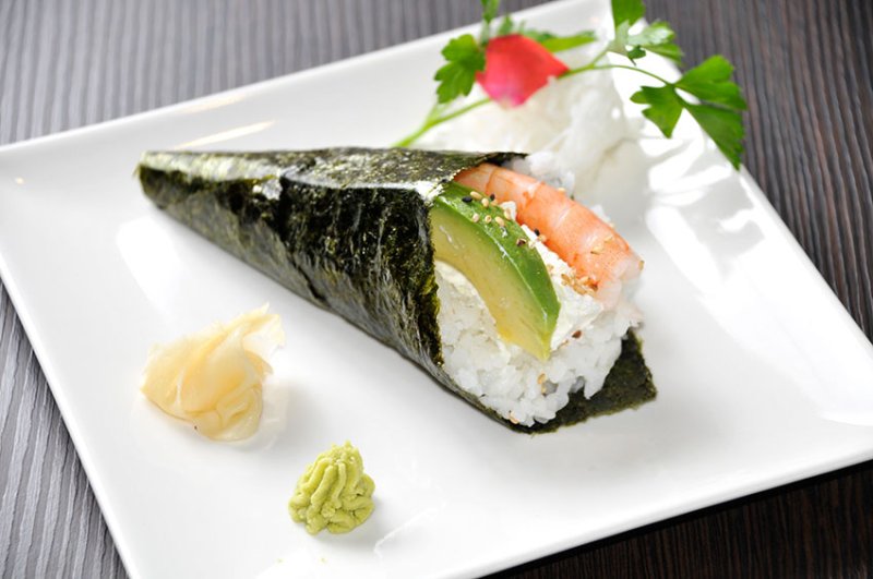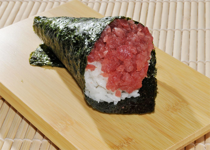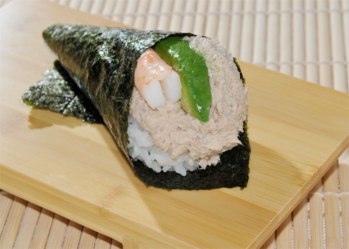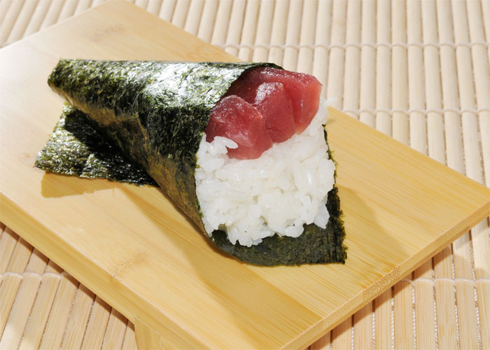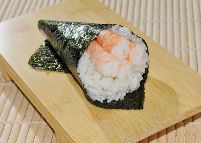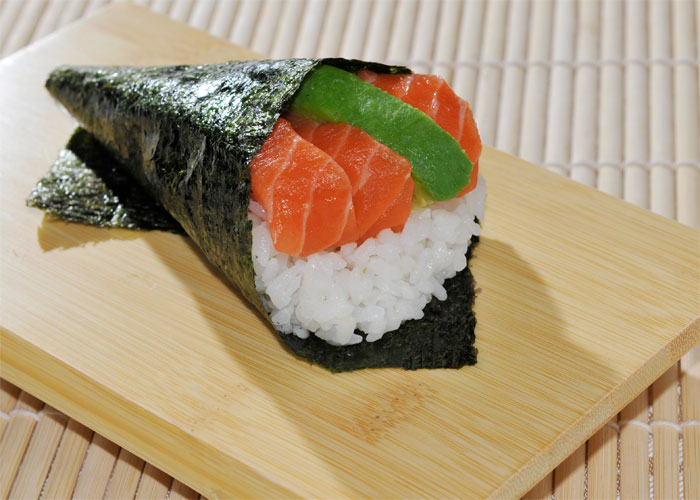 Cono di alga nori con all’interno riso e filetti di pesce crudo oppure cotto