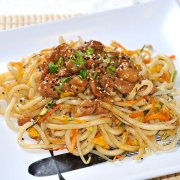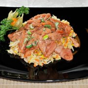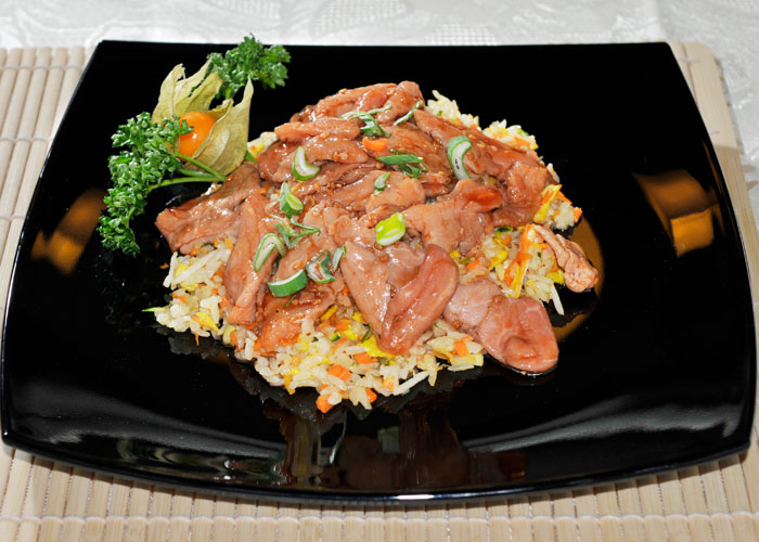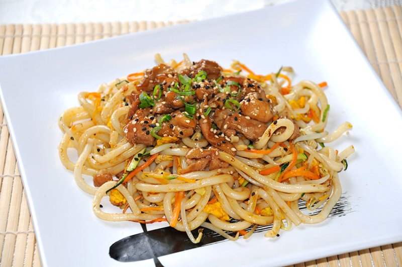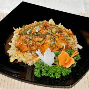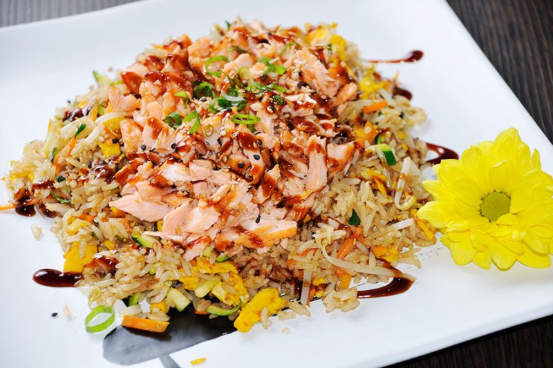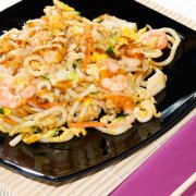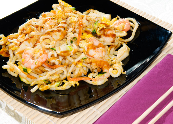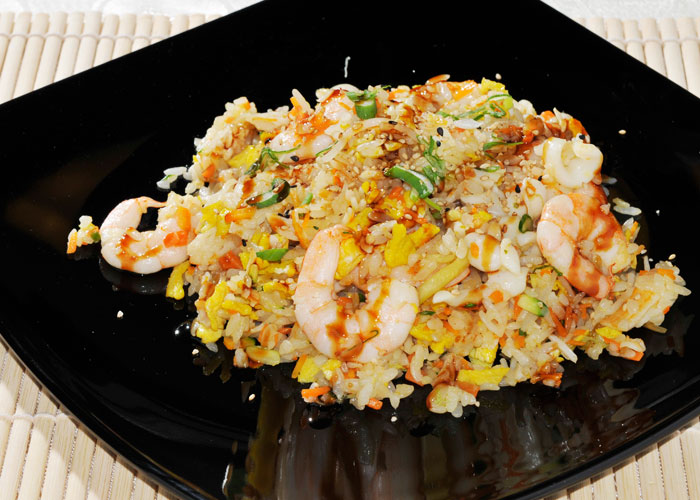 Riso bianco, riso alla piastra oppure spaghetti di grano tenero con frutti di mare, pesce o carne.