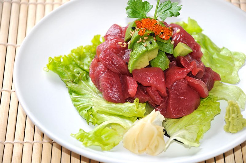 Riso, philadelphia, tonno, fiocchi di tonno striato affumicato, avocado e salsa piccante