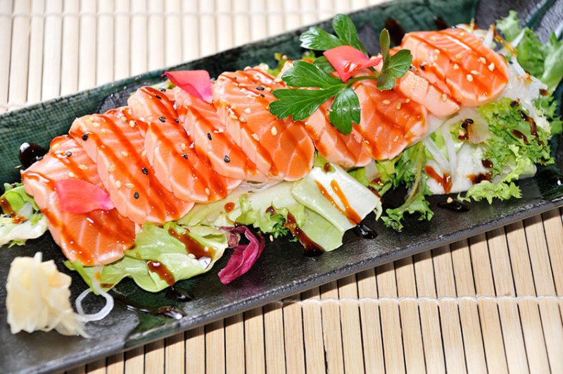 Carpaccio di salmone con aceto di riso, sesamo e cipollotti