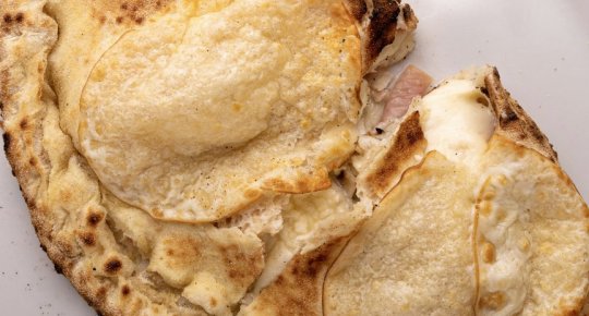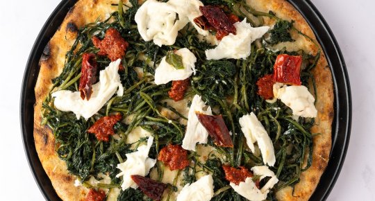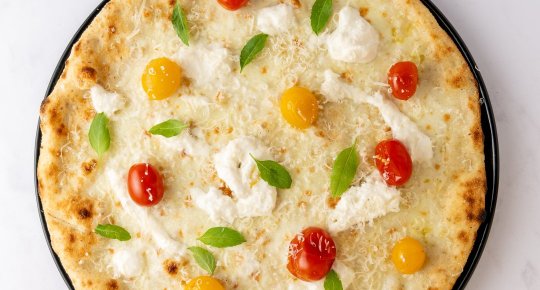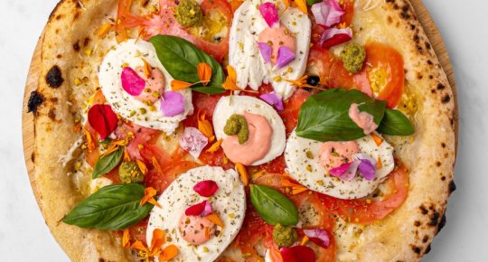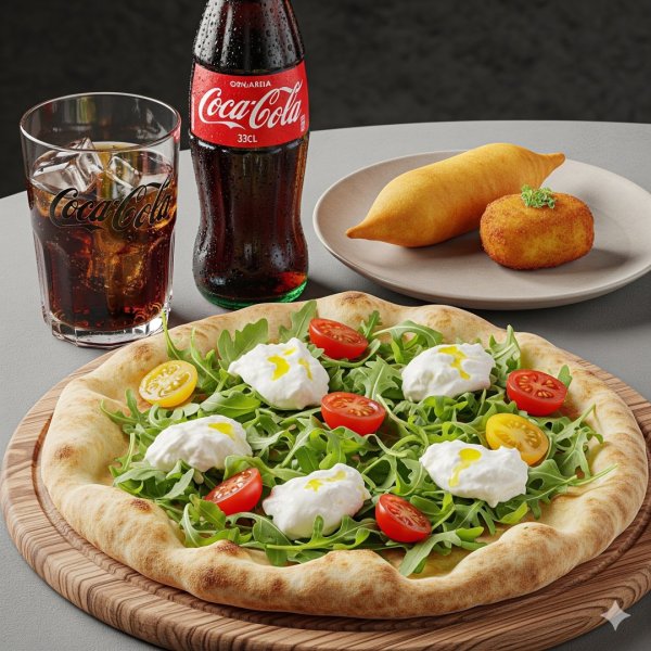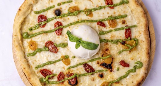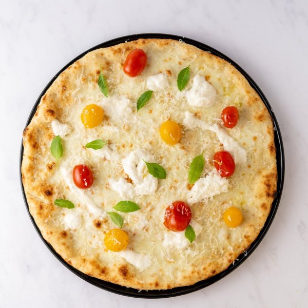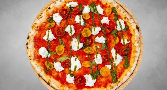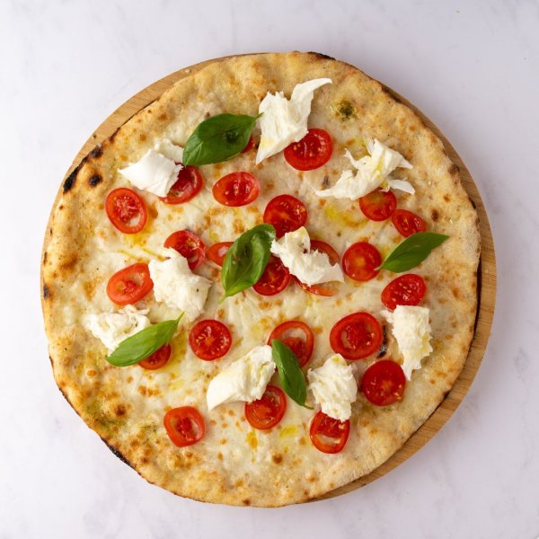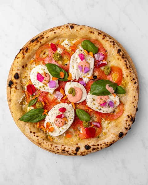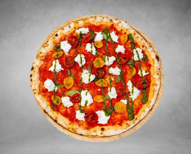 Cornicione ripieno con ricotta di bufala e crema pistacchio condita con fior di latte, pomodorini semi-dried gialli e rossi in olio EVO, pesto di pistacchio verde di Bronte DOP, burratina intera di Andria IGP 125gr e zest di limone BIO.