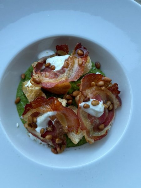Crema di piselli, crostini di pane aromatizzati *, crema di Burrata Affumicata Pugliese Dop, mandorle tostate e pancetta arrotolata croccante