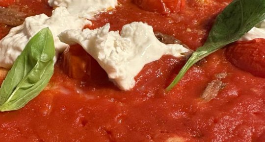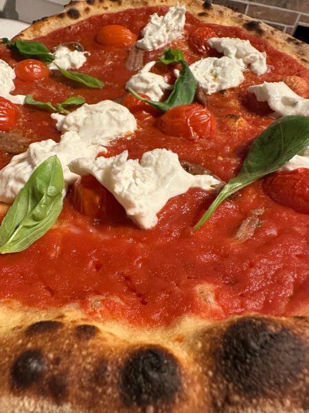 Pomodoro San Marzano, salsiccia toscana,cipolla, capperi, pomodorini , Buratta pugliese e basilico