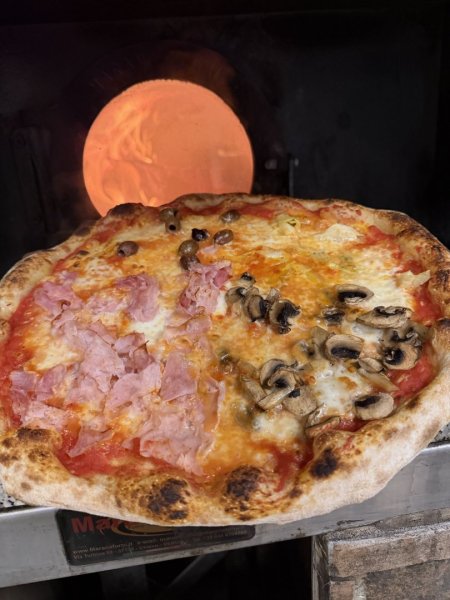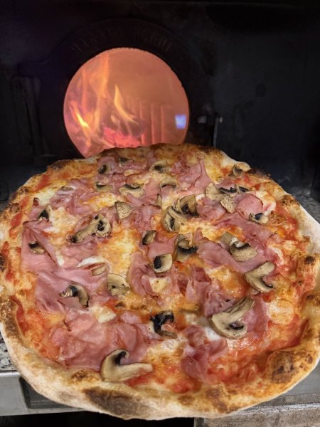 Pomodoro, mozzarella, funghi misti, prosciutto crudo