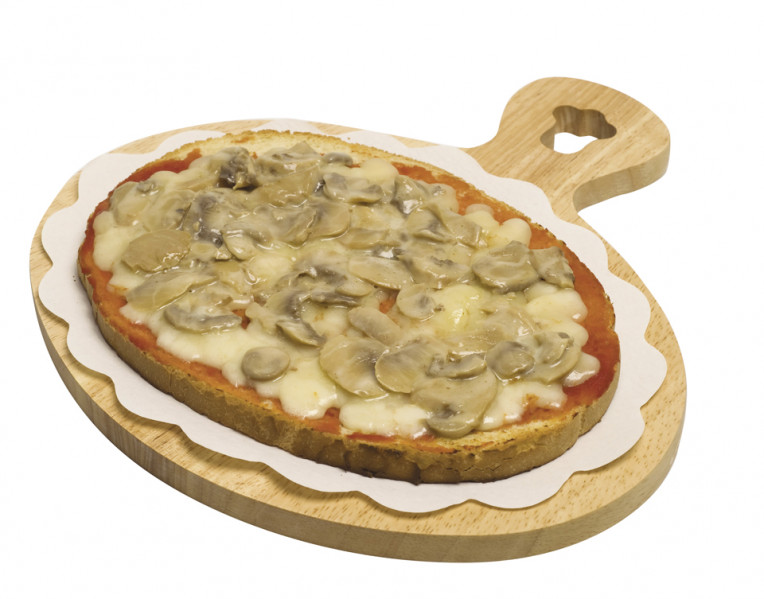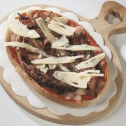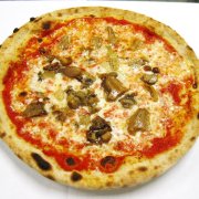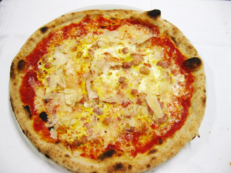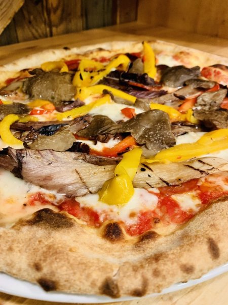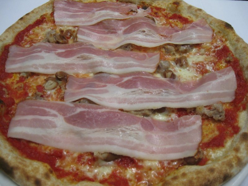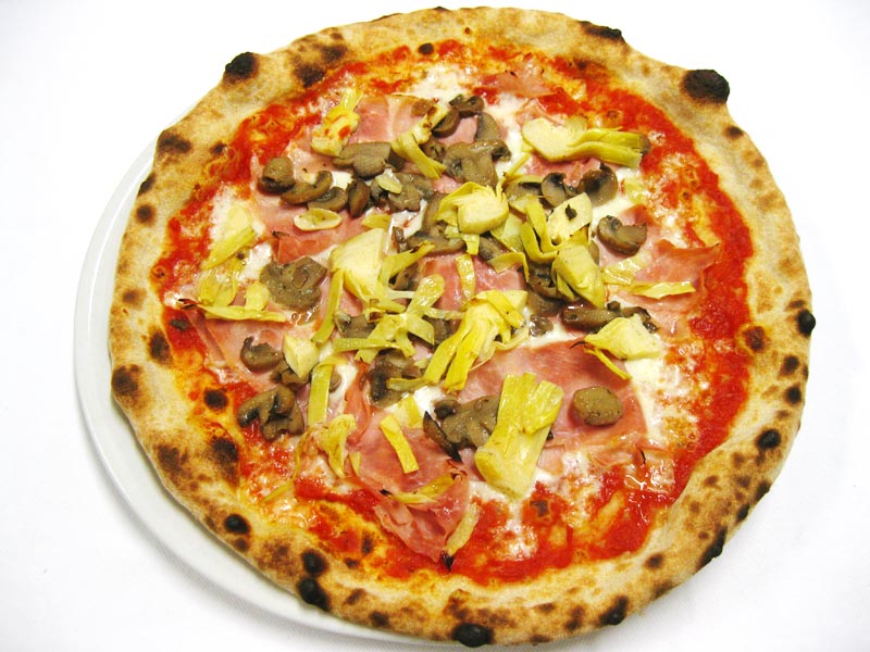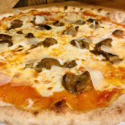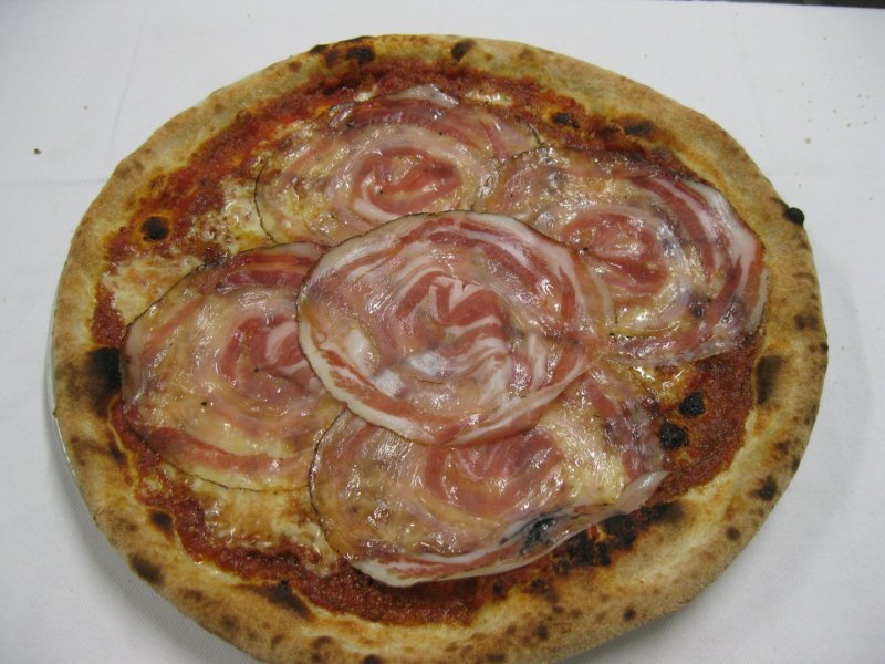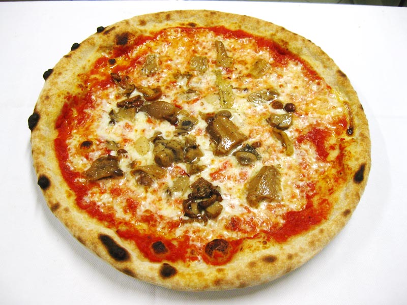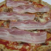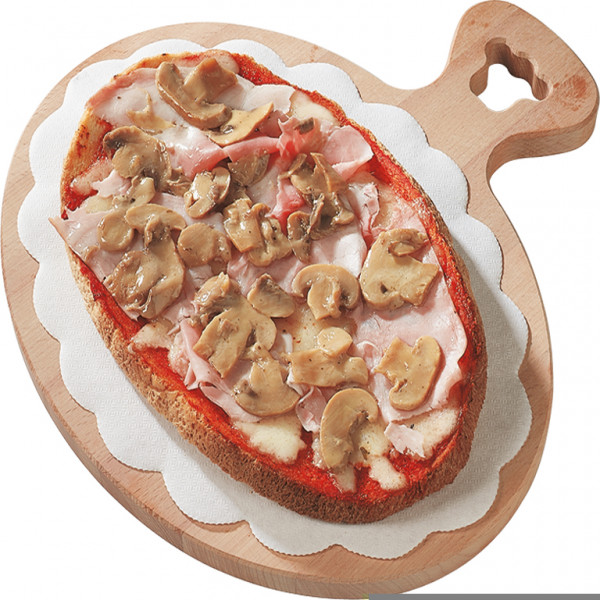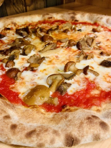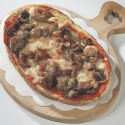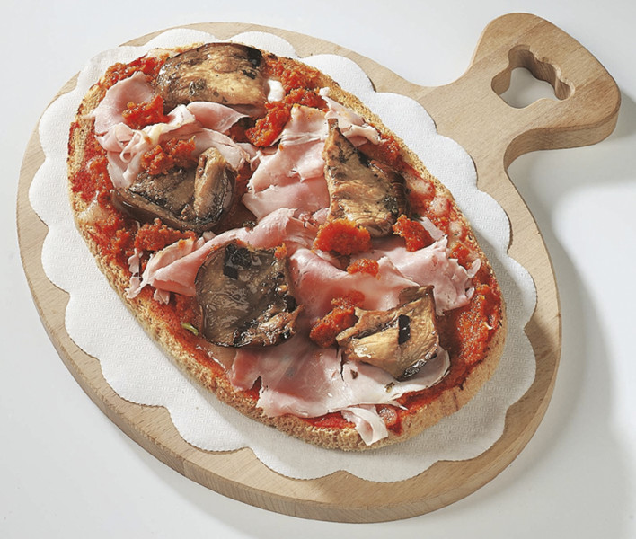 Polpa di pomodoro, formaggio, salsa peperoni e funghi prataioli, pancetta nostrana