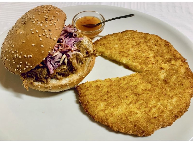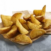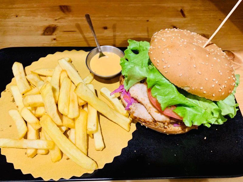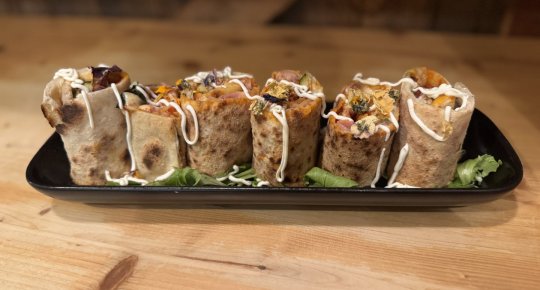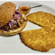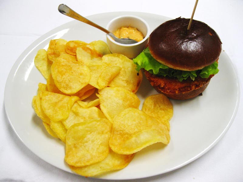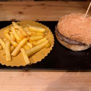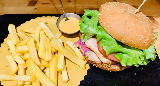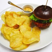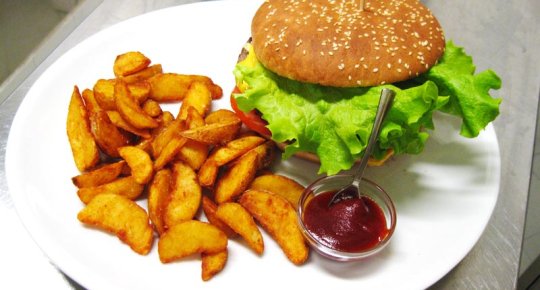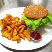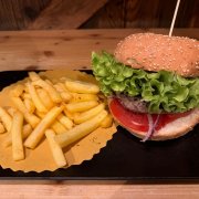 Pan focaccia, hamburger vegano (frumento, verdure, aromi) insalatina, carote, patate buccia, salsa esotica