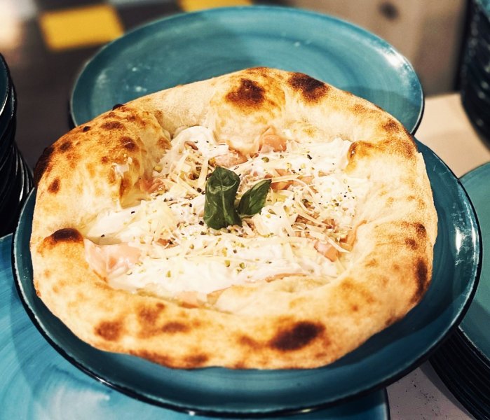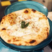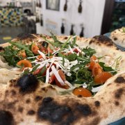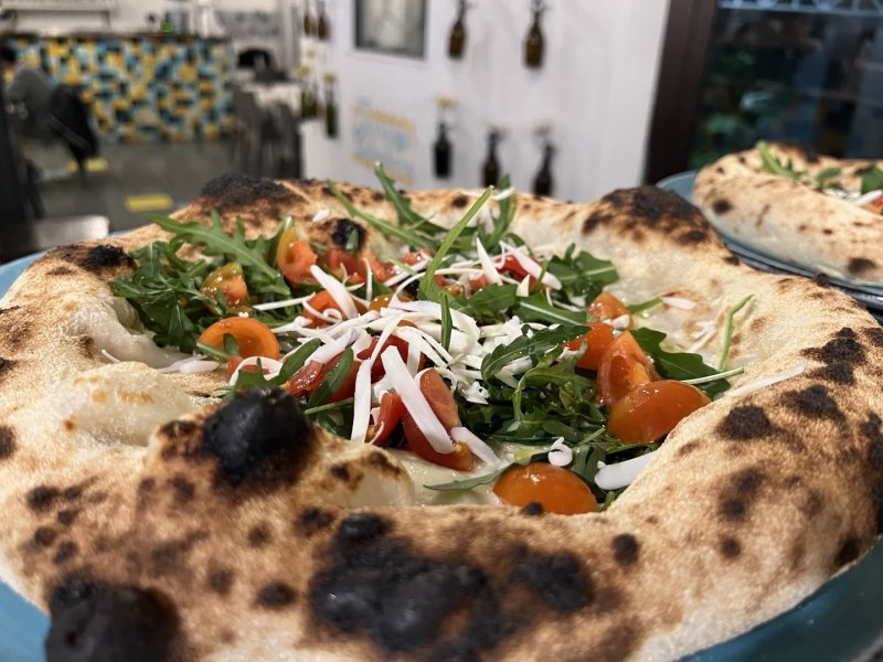 Pomodoro, mozzarella fiordilatte, salsiccia di Norcia, gamberi, rucola e grana.